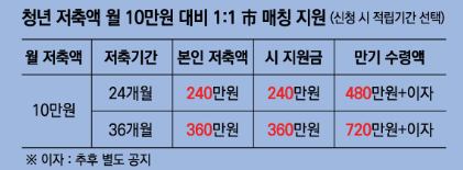 - 36개월 본인 저축액 360만원, 시 지원금 360만원, 만기 수령액 960만원+이자