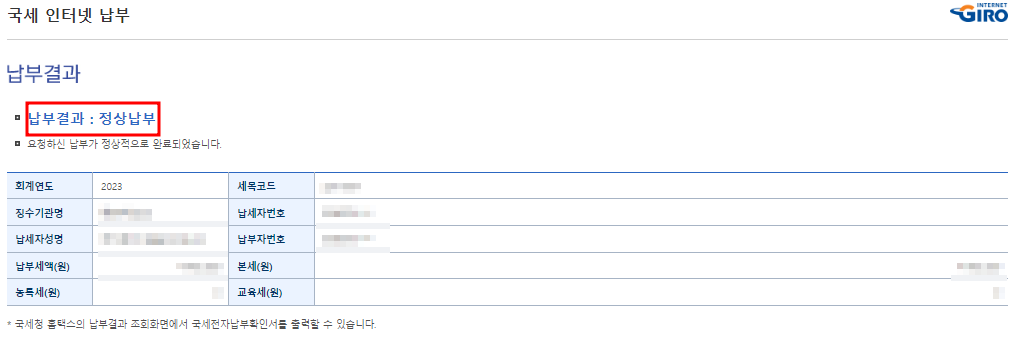 8) 납부가 완료되면 아래와 같은 팝업창이 나타납니다. 정상납부가 되었다면 창을 닫으시면 됩니다.