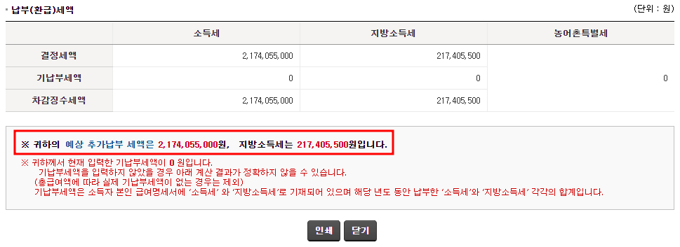 스크롤을 맨 아래로 내리면 '추가납부 세액'에 - 금액이 나오면 환급받을 금액이에요.