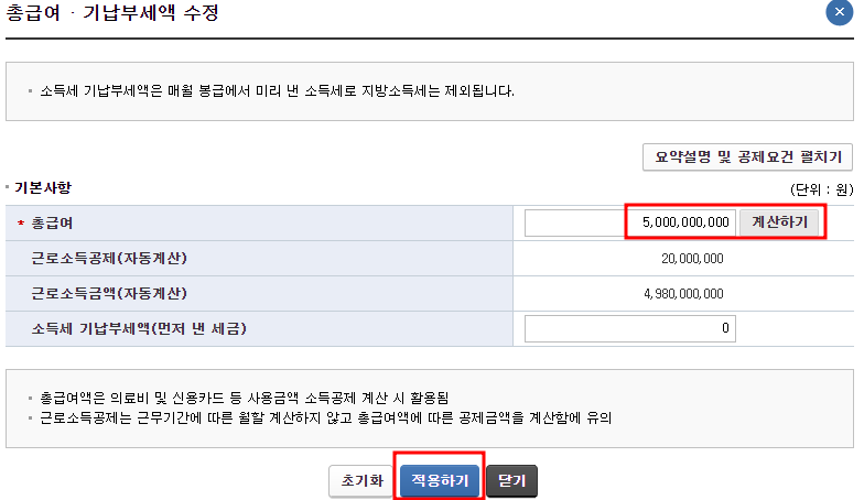 '총급여'에 급여를 입력하고 계산하기 클릭 후 적용하기를 클릭해요.